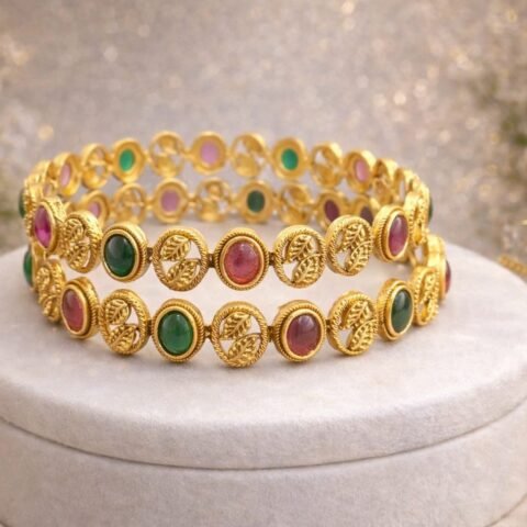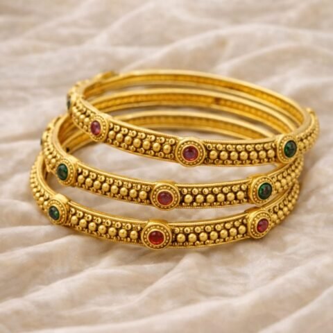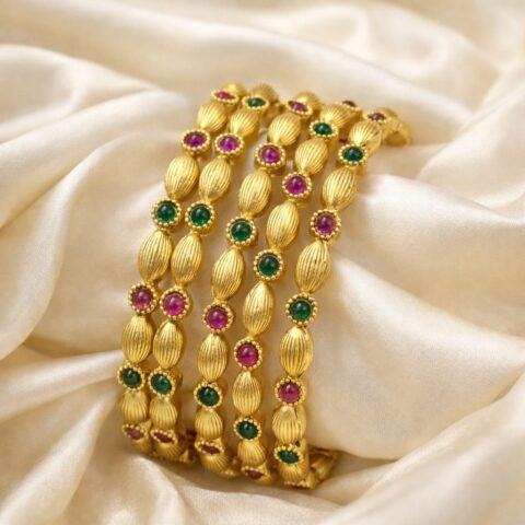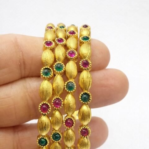 ✨ Traditional 4 Gold Beaded Bangles with Red & Green Stones designed Isabel jewels size 2’8
