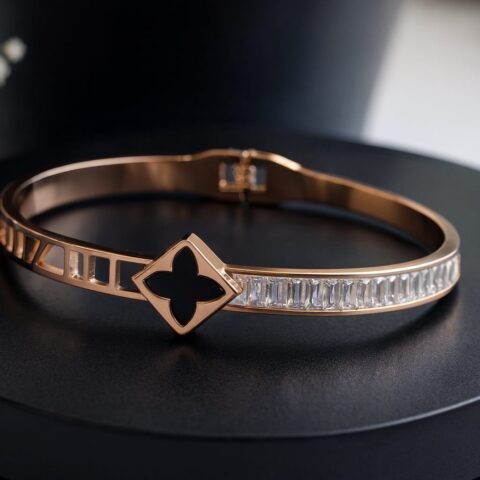 Elegant Rose Gold Stainless Steel Girls Bracelet – Trendy Black Clover & Crystal Design(5cm diameter) designed Isabel jewels