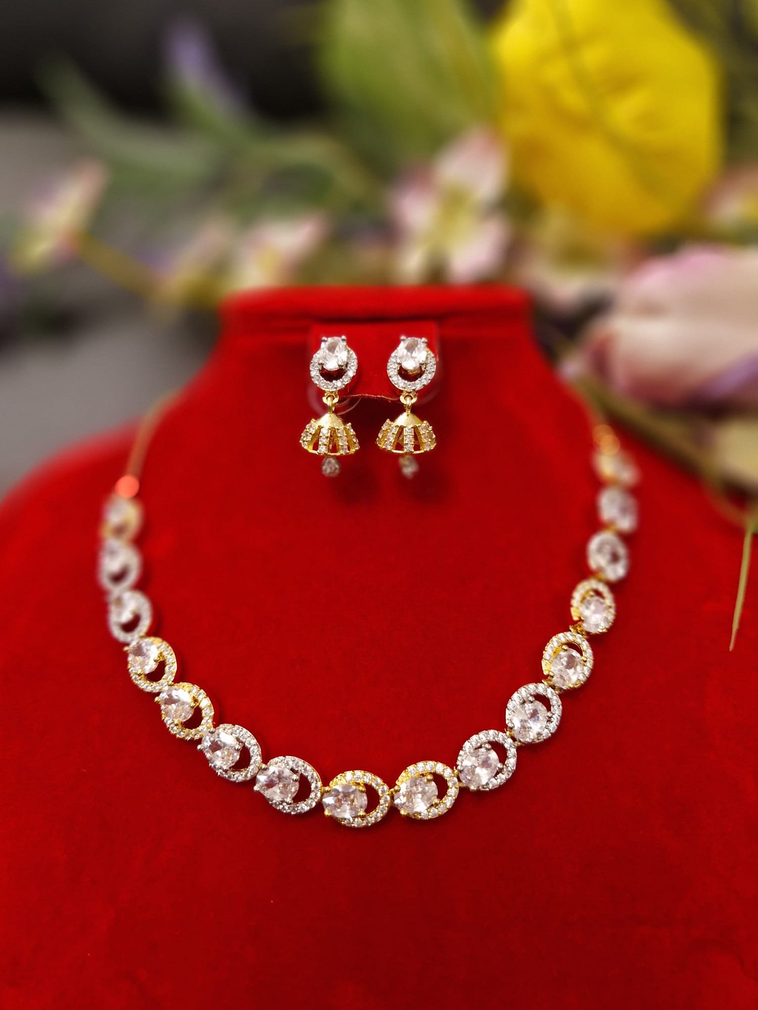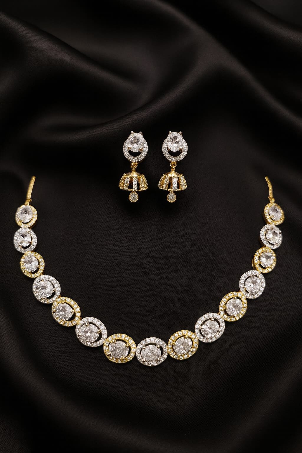 A stunning two-tone necklace and earring set featuring oval-shaped, diamond-studded motifs in alternating gold and silver tones. The matching jumka-style earrings add an elegant traditional touch, making this set perfect for special occasions.