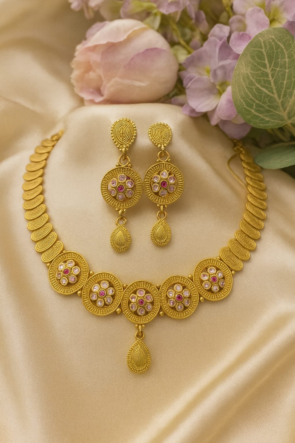 Beautiful antique gold-plated necklace set featuring floral coin motifs adorned with pink and white stones. Paired with matching drop earrings, this traditional ethnic jewellery is perfect for weddings, festive wear, and cultural occasions.
