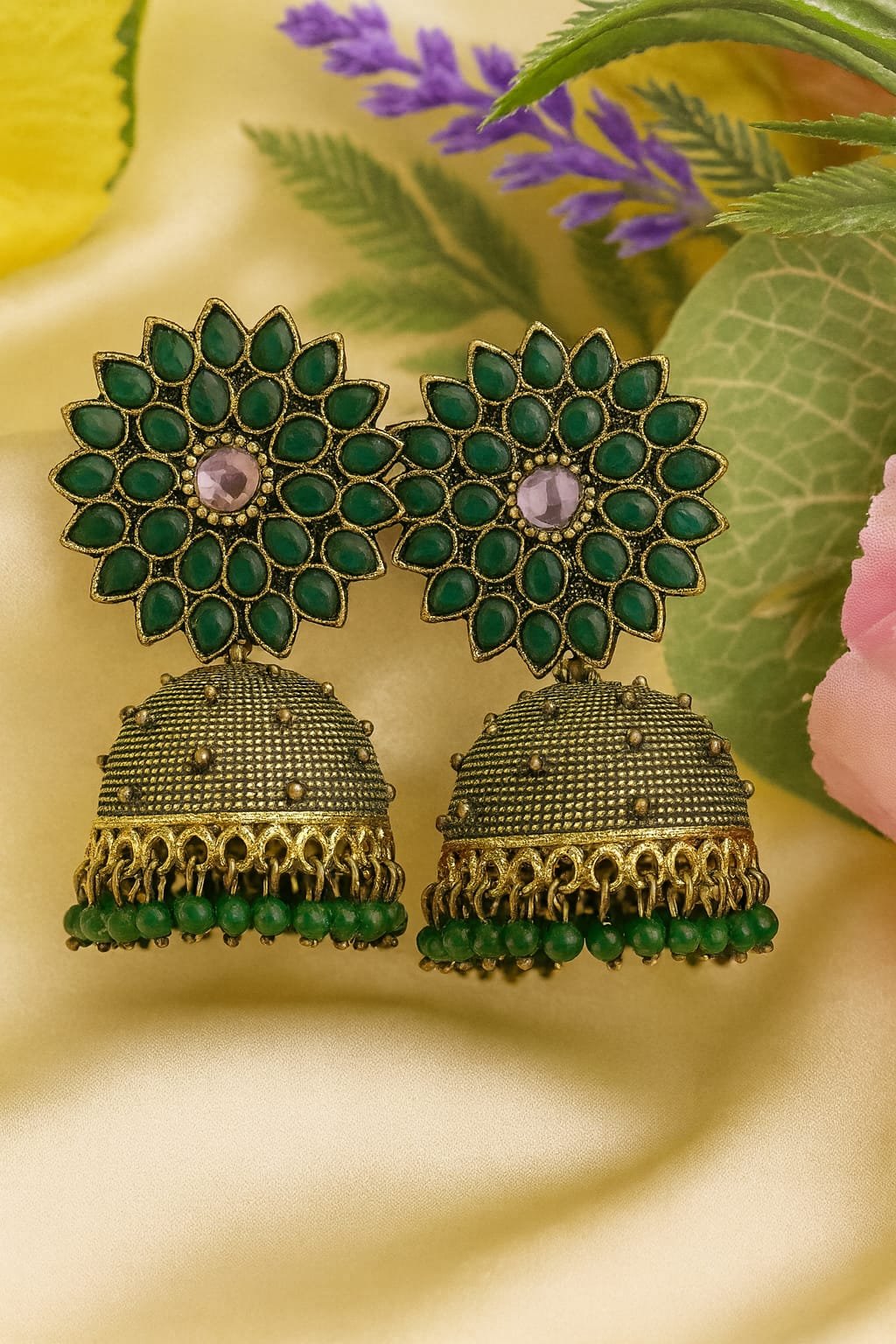 Add a touch of ethnic elegance with these stunning antique green jhumka earrings, featuring a floral stone-studded top and intricately designed dome hangings. Perfect for festivals, weddings, parties, and traditional outfits, these women’s ethnic earrings are a trending choice for those searching for jhumka earrings, traditional jewellery, and antique gold fashion earrings.