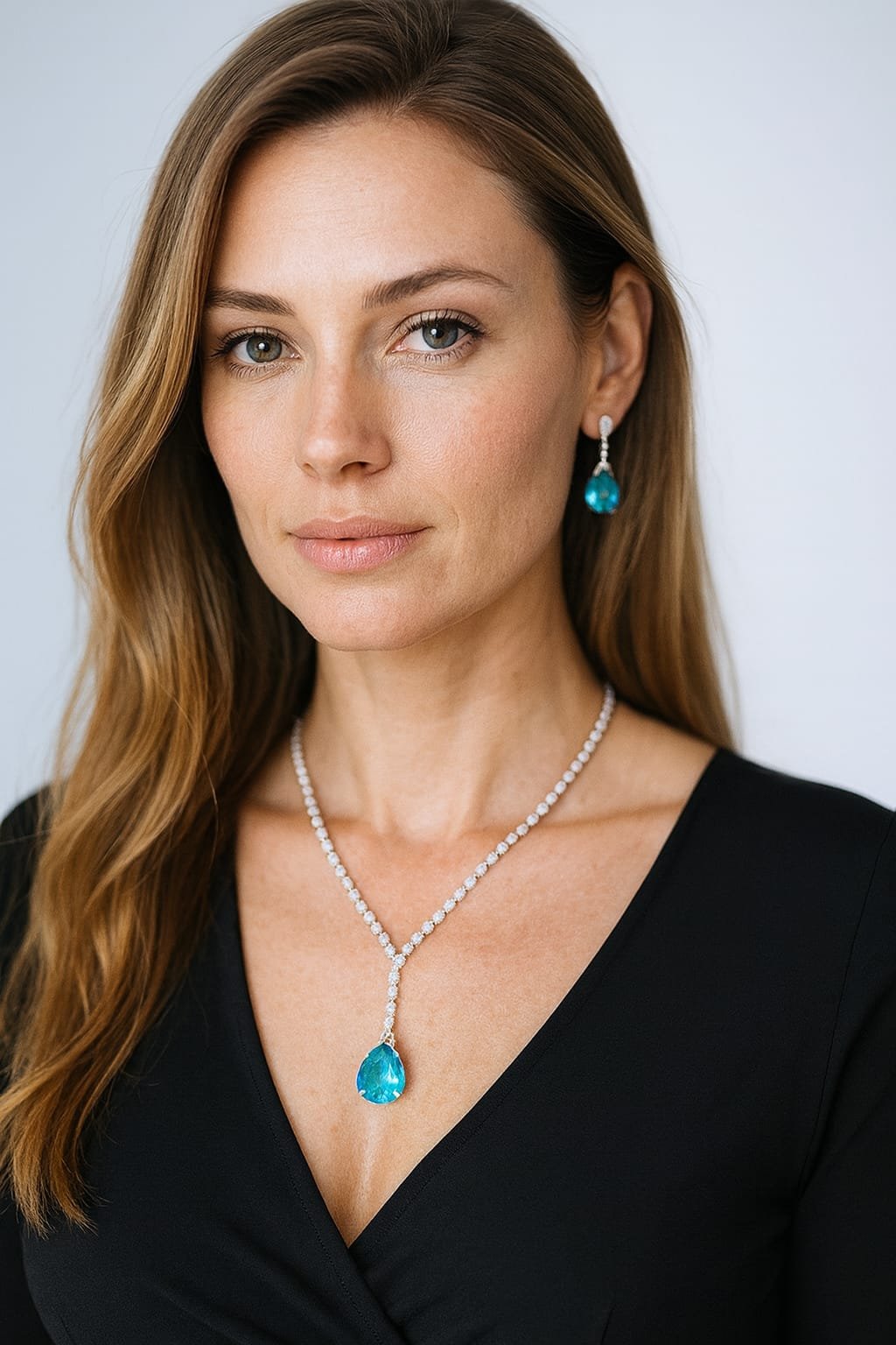 Elevate your style with this stunning aqua blue crystal drop necklace set, designed with a sparkling diamond-cut rhinestone chain and matching teardrop earrings. Perfect for party wear, bridal wear, evening gowns, and special occasions, this elegant jewellery set adds a modern, classy, and premium touch to any outfit. A must-have trending necklace set for women looking for timeless elegance.