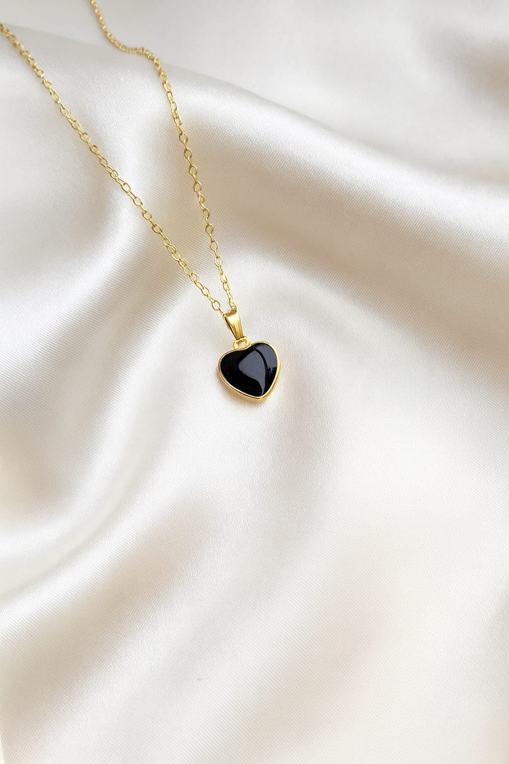 This beautiful [double sided black and gold] heart pendant necklace features a glossy heart-shaped charm framed in elegant gold, hanging from a delicate gold-tone chain. Its minimalist design, dainty style, and classy black enamel finish make it one of the most searched and popular fashion accessories online.