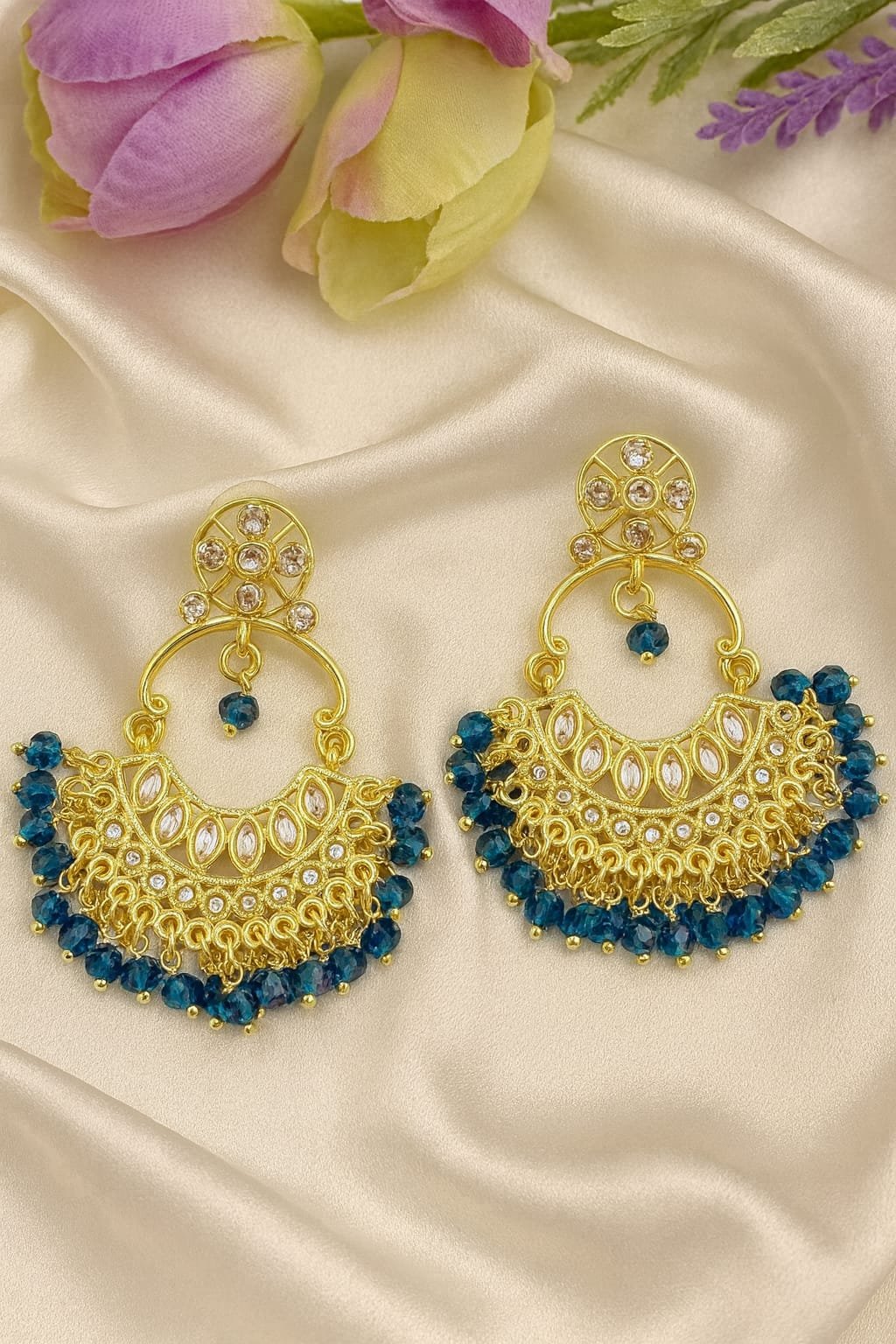 Make a bold style statement with these stunning Blue Beaded Kundan Chandelier Earrings, designed for women who love elegant, eye-catching jewellery. These earrings feature intricate Kundan detailing, sparkling AD stones, and a cascading layer of rich blue crystal beads, giving them a luxurious and festive finish.