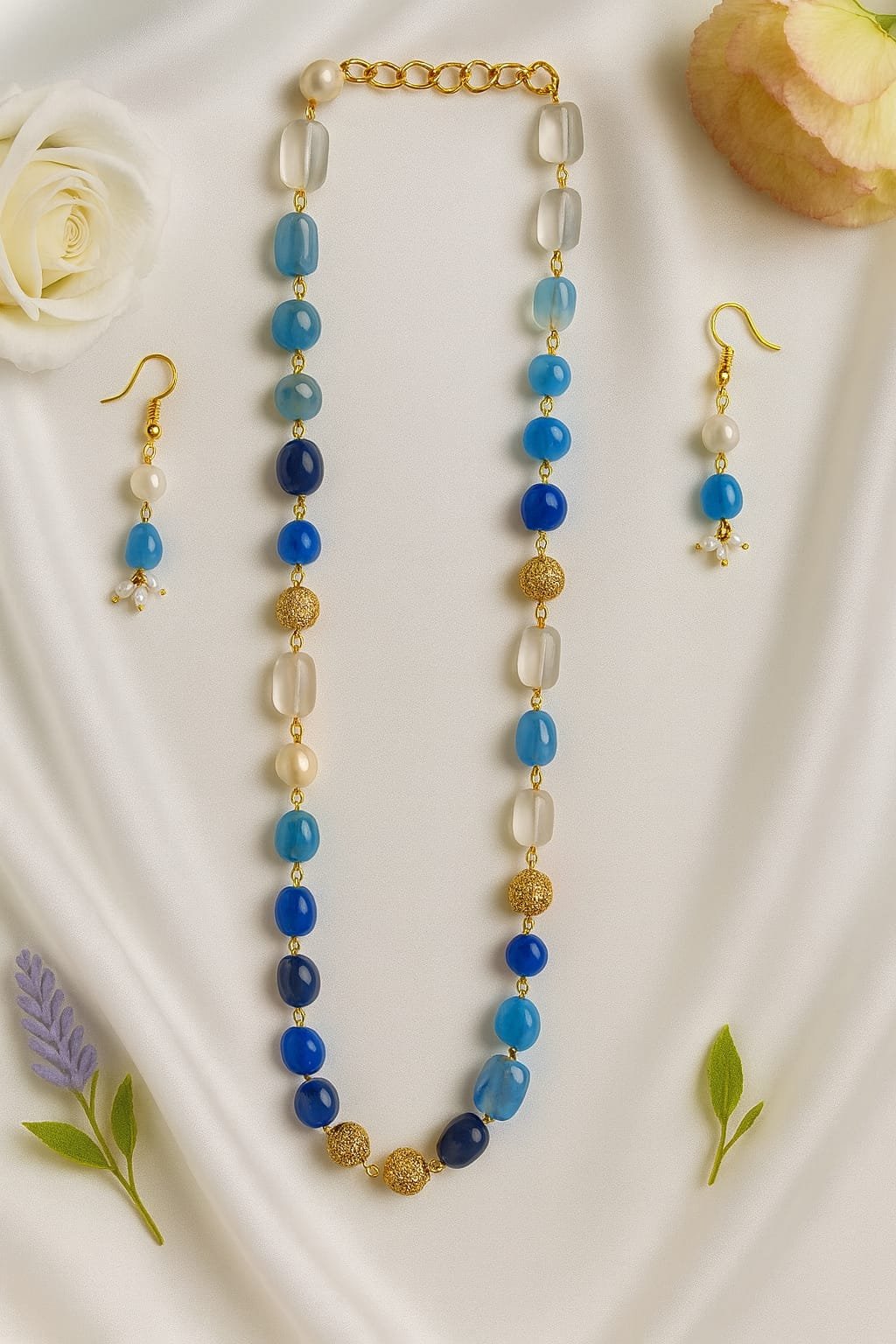 A beautiful mix of multi-shade blue beads, pearls, and gold accents, paired with matching earrings. Perfect for parties, gifting, and everyday elegance.