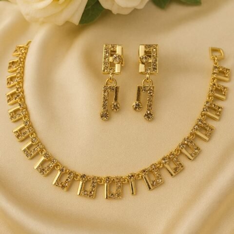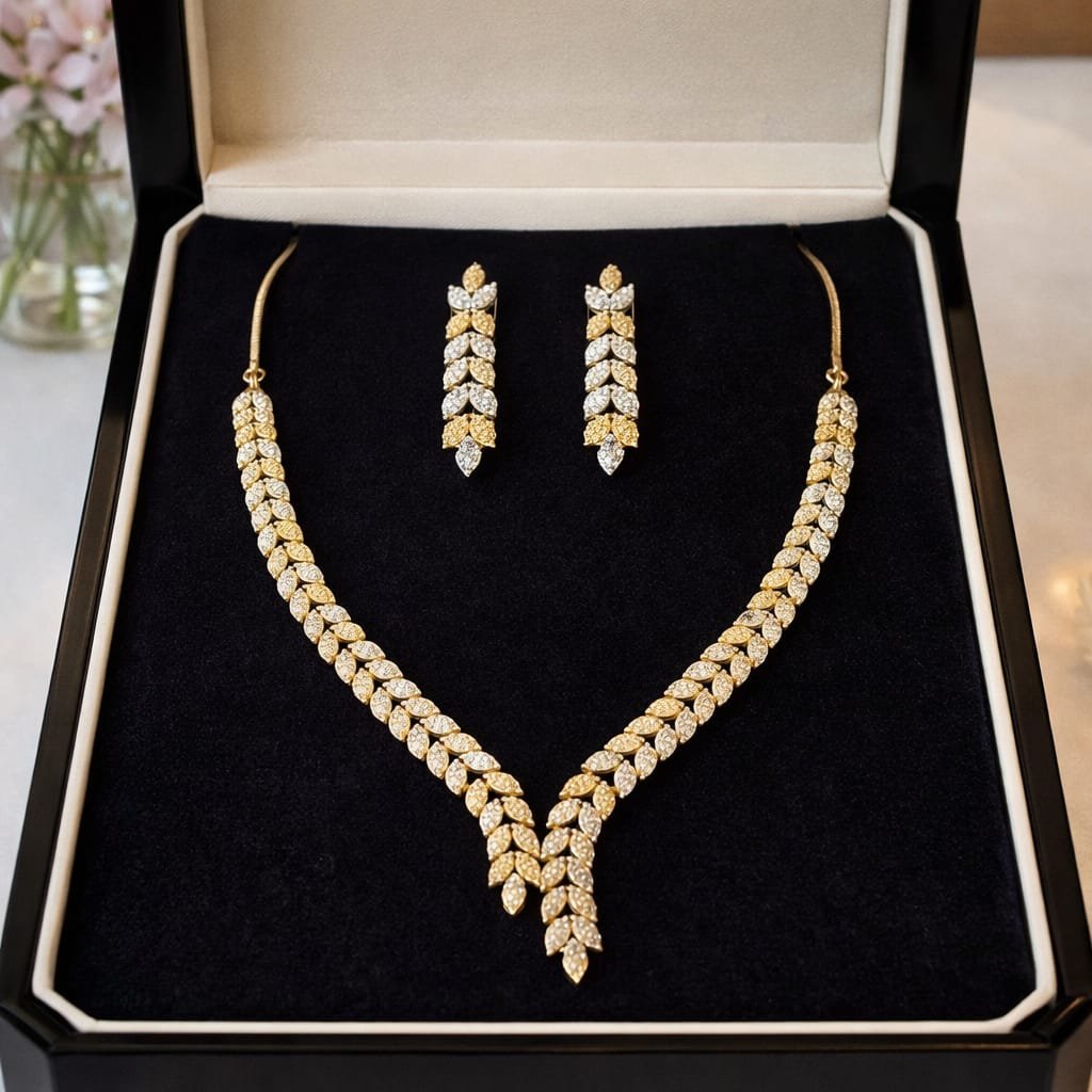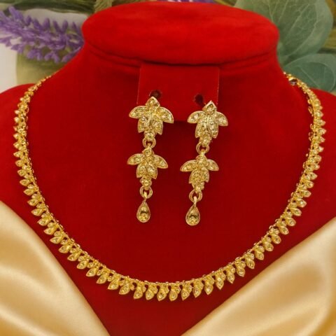 Designed for modern elegance, this set is ideal for women searching online for bridal necklace set, party wear jewellery, leaf design necklace, or luxury gold and silver necklace with earrings. Its lightweight yet premium appearance makes it perfect for both traditional outfits and contemporary styling.