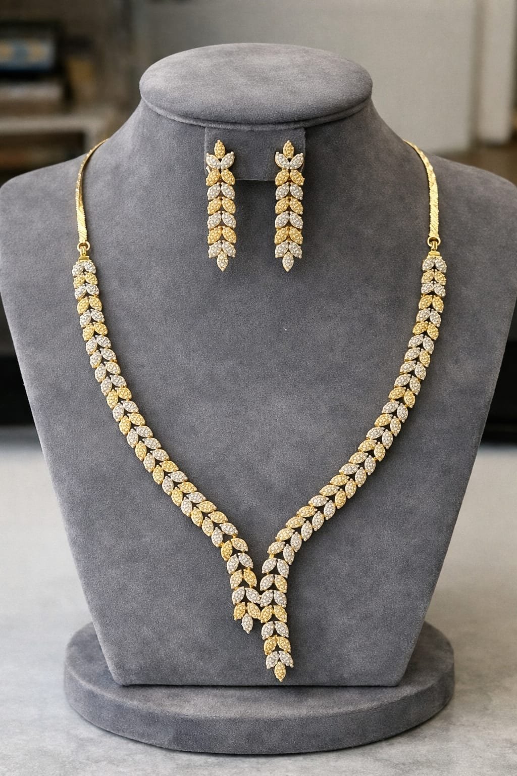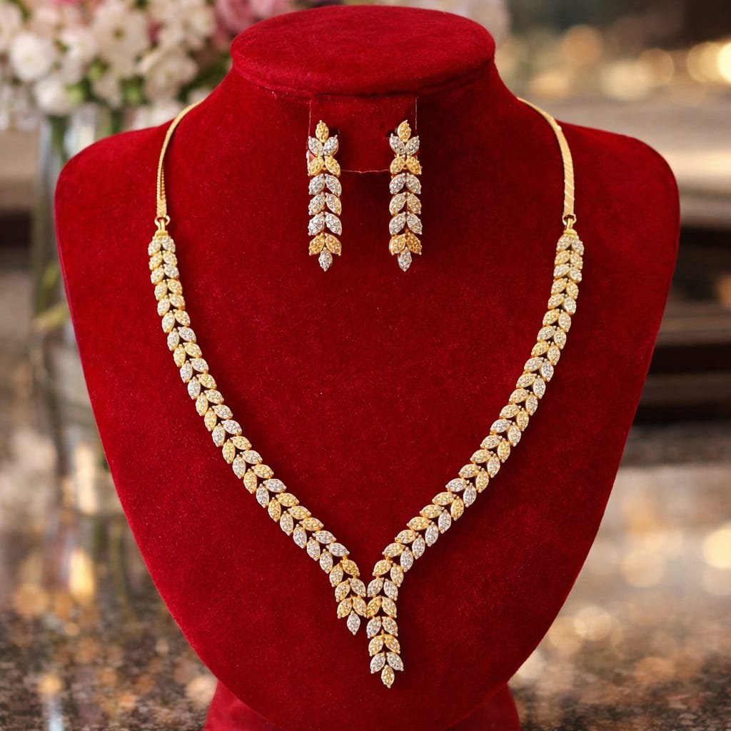 This stunning gold and silver coloured necklace set features a graceful leaf design pattern highlighted with sparkling stone detailing, creating a luxurious diamond-style finish. The long V-shaped necklace paired with matching drop earrings gives a refined and sophisticated look, perfect for weddings, parties, and festive occasions.