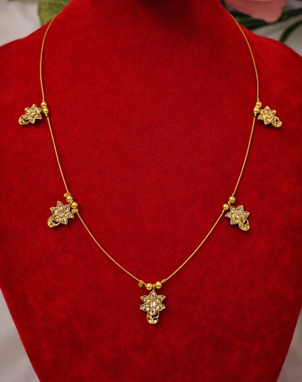 This beautiful gold-tone floral necklace features a delicate thin chain adorned with charming flower motifs and sparkling stone detailing, giving it a classy yet lightweight look. The simple floral pendant at the centre makes this necklace perfect for everyday elegance as well as festive wear.