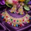 This stunning gold-tone necklace and earrings set features a graceful floral design accented with multicolour pastel stones and sparkling American diamond (CZ) stones. The necklace showcases a delicate chain pattern with evenly spaced flower motifs, while the matching dangling earrings complete the look with refined elegance.