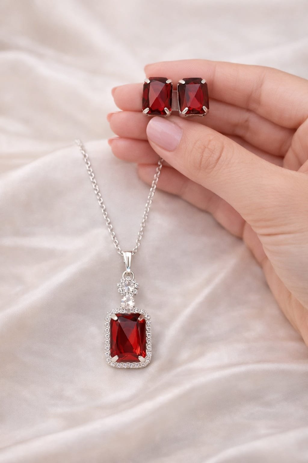 This stunning jewellery set features a deep red rectangular crystal pendant paired with matching red crystal stud earrings, beautifully crafted for a bold and luxurious look. The pendant is framed with a sparkling halo of clear stones and suspended from a sleek silver-tone chain, creating a perfect balance of modern elegance and timeless charm.