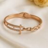 This stunning rose gold stainless steel bracelet for girls features a luxurious blend of modern elegance and timeless charm. The centrepiece is a stylish black clover charm, a symbol widely loved for luck, fashion, and trend appeal. One half of the bracelet showcases premium baguette-cut crystals, giving it a high-end, sparkle-rich finish, while the other half has chic geometric cut-out detailing.
