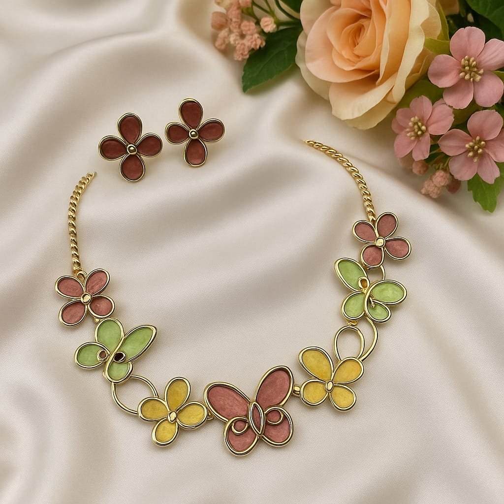 Chic enamel necklace set featuring multicolour floral and butterfly motifs in soft pink, green, and yellow shades. Lightweight fashion jewellery with matching stud earrings — perfect for casual wear, gifting, and festive styling.