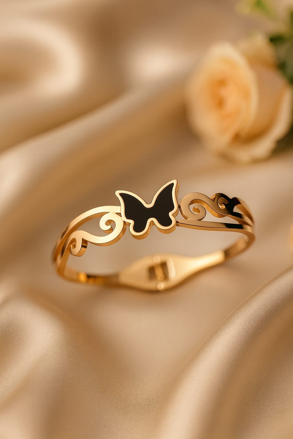 This beautiful girls’ stainless steel bracelet features a chic gold-tone finish with a stylish black butterfly charm at the centre. The elegant swirl-cut design on both sides adds a touch of sophistication, making it perfect for daily wear as well as special occasions.