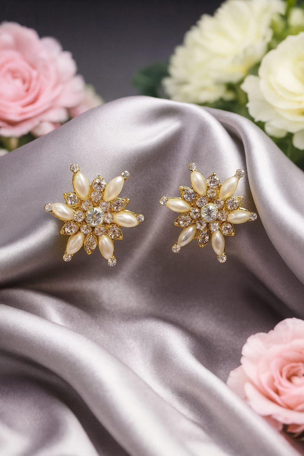 These stunning gold pearl flower stud earrings feature a beautifully crafted floral design with lustrous oval pearls and sparkling crystal stones. Each petal is delicately set to create a radiant star-like bloom, making these earrings a perfect choice for weddings, festive celebrations, parties, and special occasions.