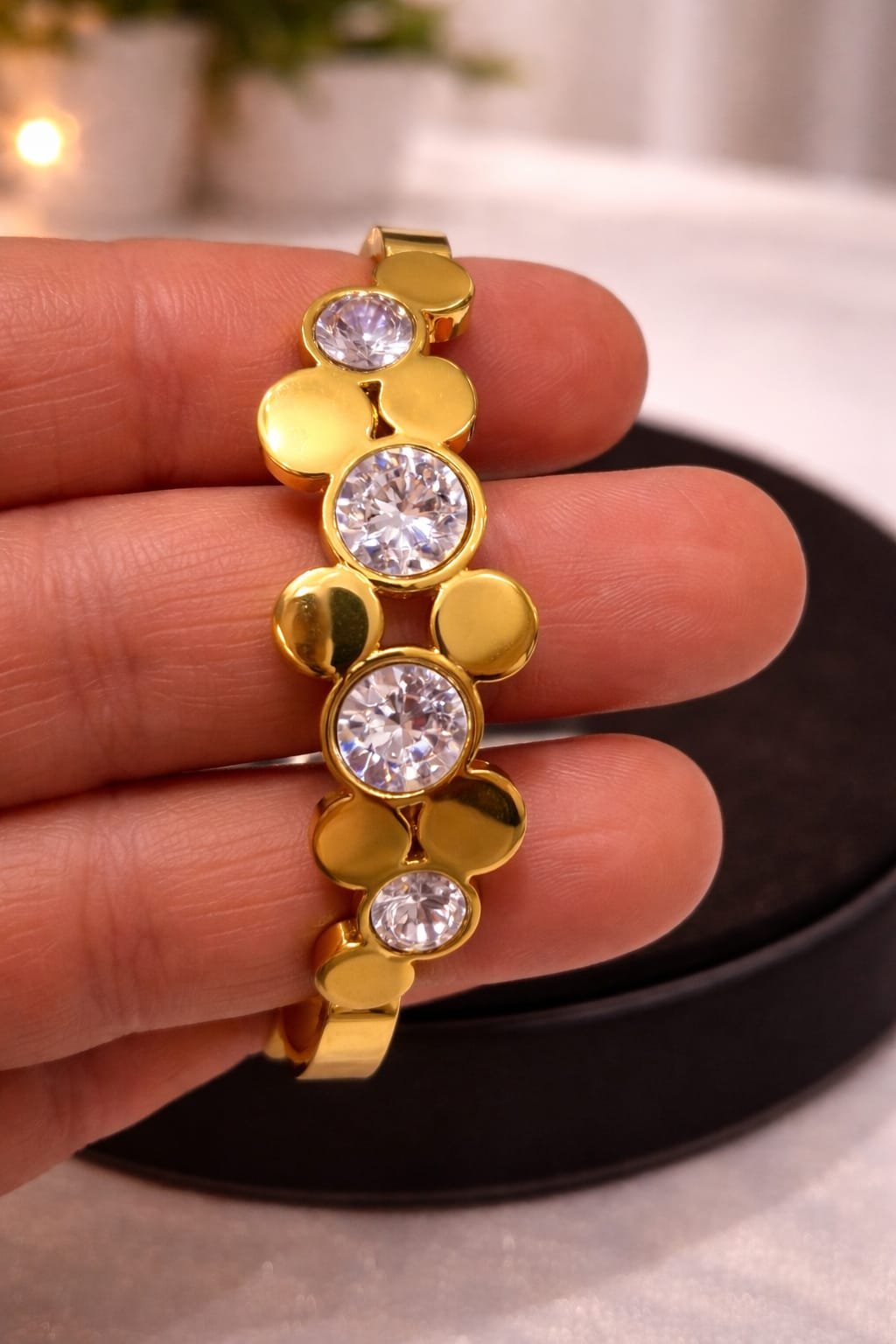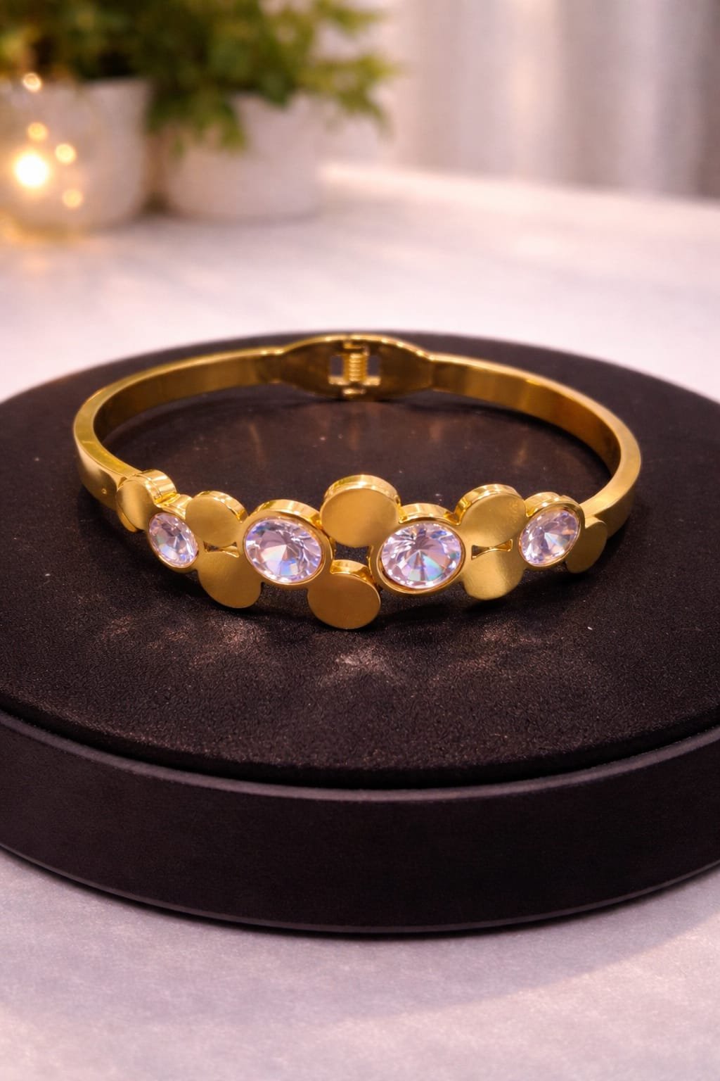 This elegant gold-plated bangle bracelet features a sleek, modern silhouette adorned with sparkling round-cut crystal stones set in a stylish floral-inspired pattern. The high-polish gold finish adds a luxurious shine, while the secure clasp ensures a comfortable and perfect fit. Ideal for women who love minimal yet glamorous jewellery, this bracelet effortlessly elevates any outfit.