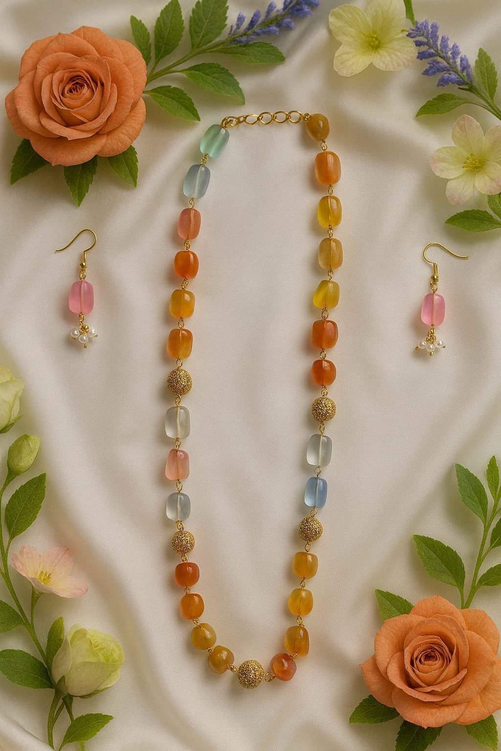 Brighten your look with this elegant handmade multicolor beaded necklace and earring set, designed with smooth gradient beads in warm orange, soft yellow, pastel blue, and pink tones. The necklace features gold-textured statement beads that add a luxurious touch, making it the perfect accessory for parties, festive wear, casual outfits, and special occasions.
