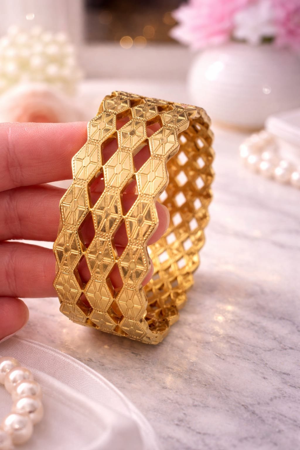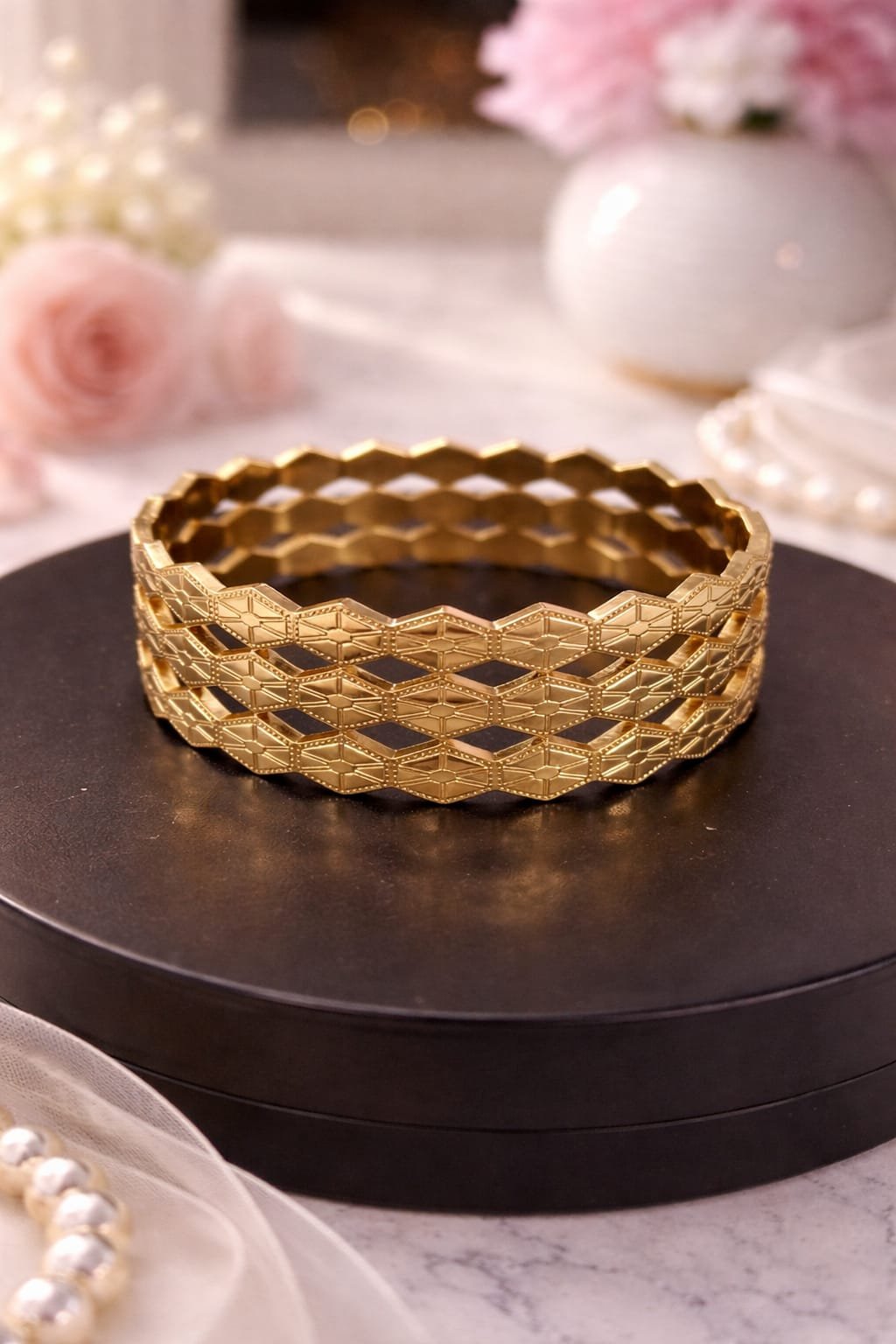 Add a touch of modern elegance to your jewellery collection with these matte gold cut-out bangles, designed with a stylish geometric pattern. Lightweight, durable, and perfect for daily wear, these bangles pair effortlessly with both ethnic and western outfits. A must-have women’s gold bangle set for fashion lovers looking for something unique and trending.