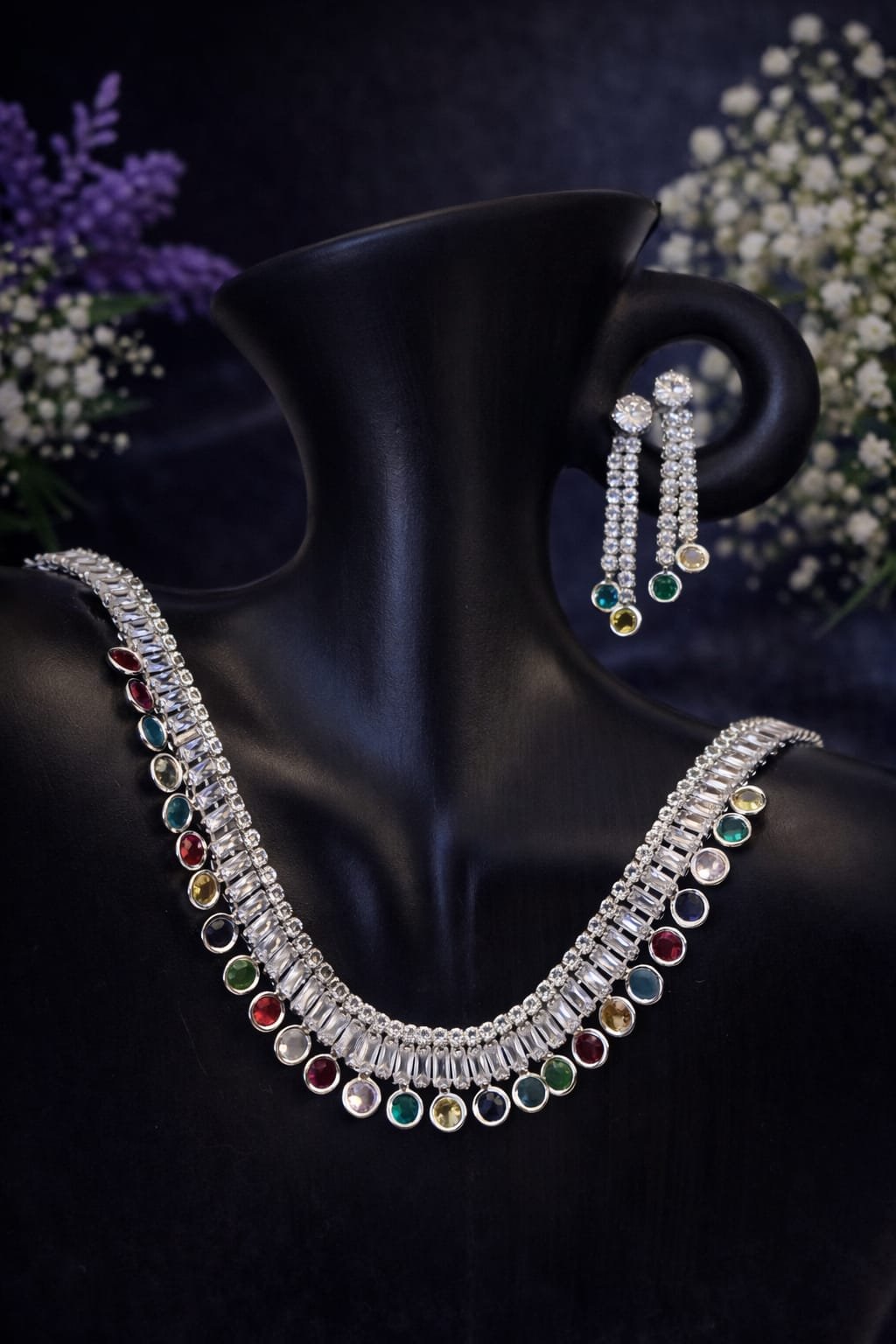 This elegant multicolour gemstone necklace set features a stunning blend of diamond-look baguette stones and vibrant round coloured gemstones, creating a luxurious and modern statement design. Finished in a high-shine silver-tone setting, the necklace is paired with matching long drop earrings, making it a complete designer jewellery set for special occasions.