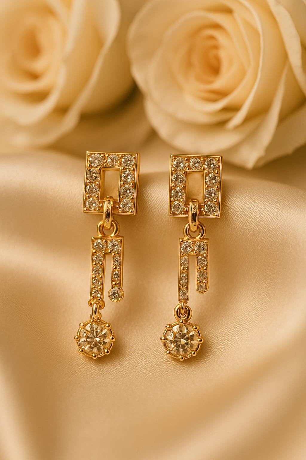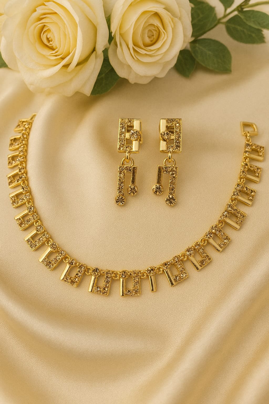 Elegant gold necklace and earring set featuring sparkling rectangular charms and musical note–inspired drops.