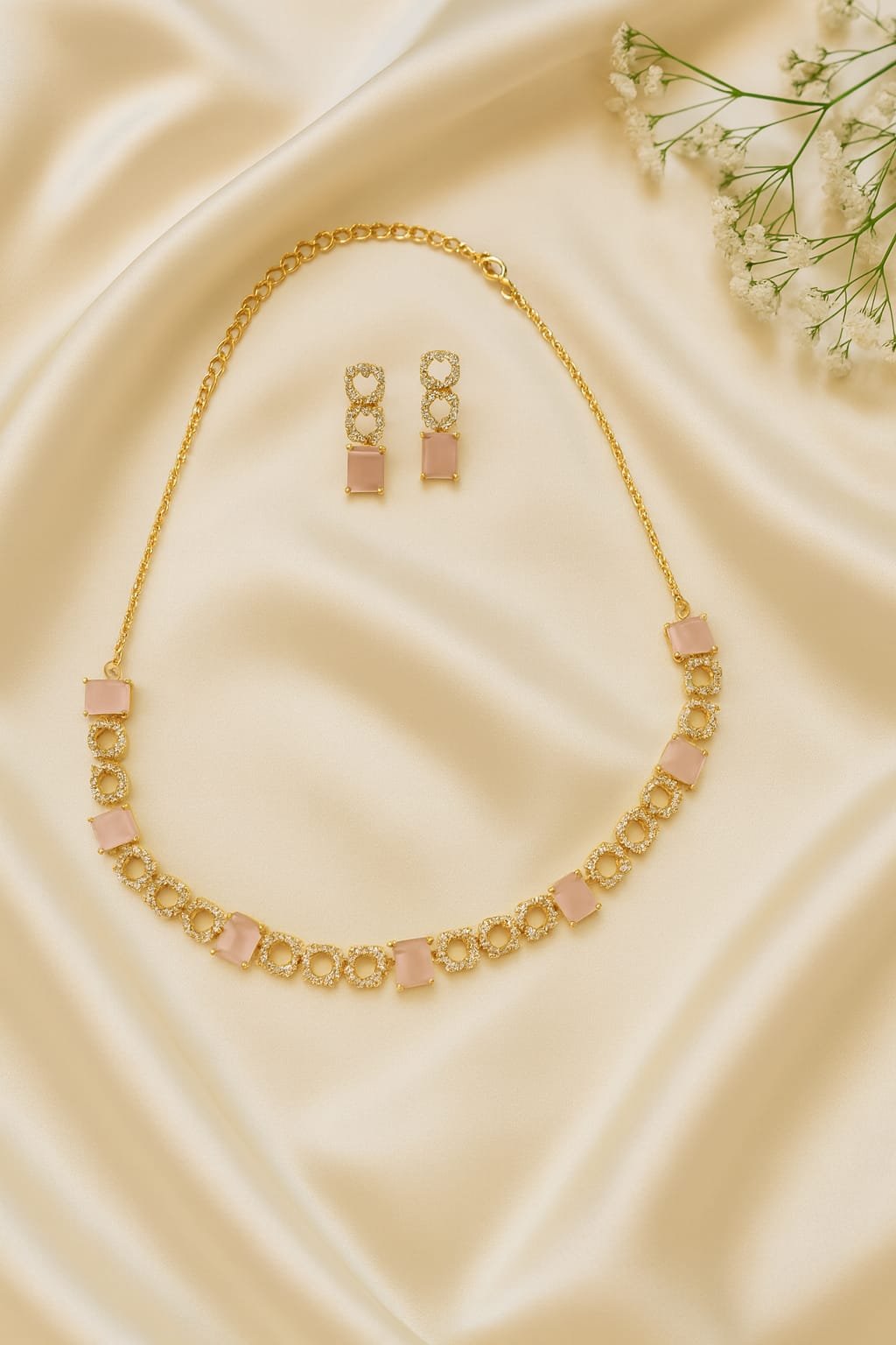 This beautiful pastel pink necklace and earring set features soft square stones paired with sparkling gold textured links, giving it a classy and modern party-wear look. The matching drop earrings complete the set, making it perfect for any special occasion.