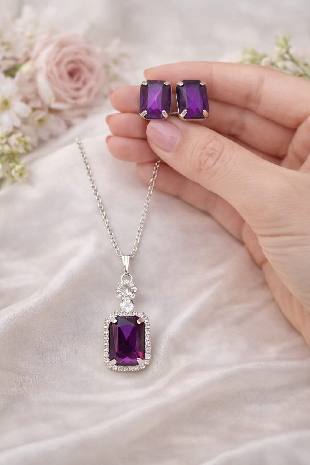 This elegant silver-plated jewellery set features a rich purple rectangular crystal pendant paired with matching purple crystal stud earrings. The pendant is beautifully accented with a sparkling halo of clear stones, giving it a luxurious, high-shine finish. Designed for modern women who love classic elegance with a trendy touch, this set is perfect for both everyday wear and special occasions.