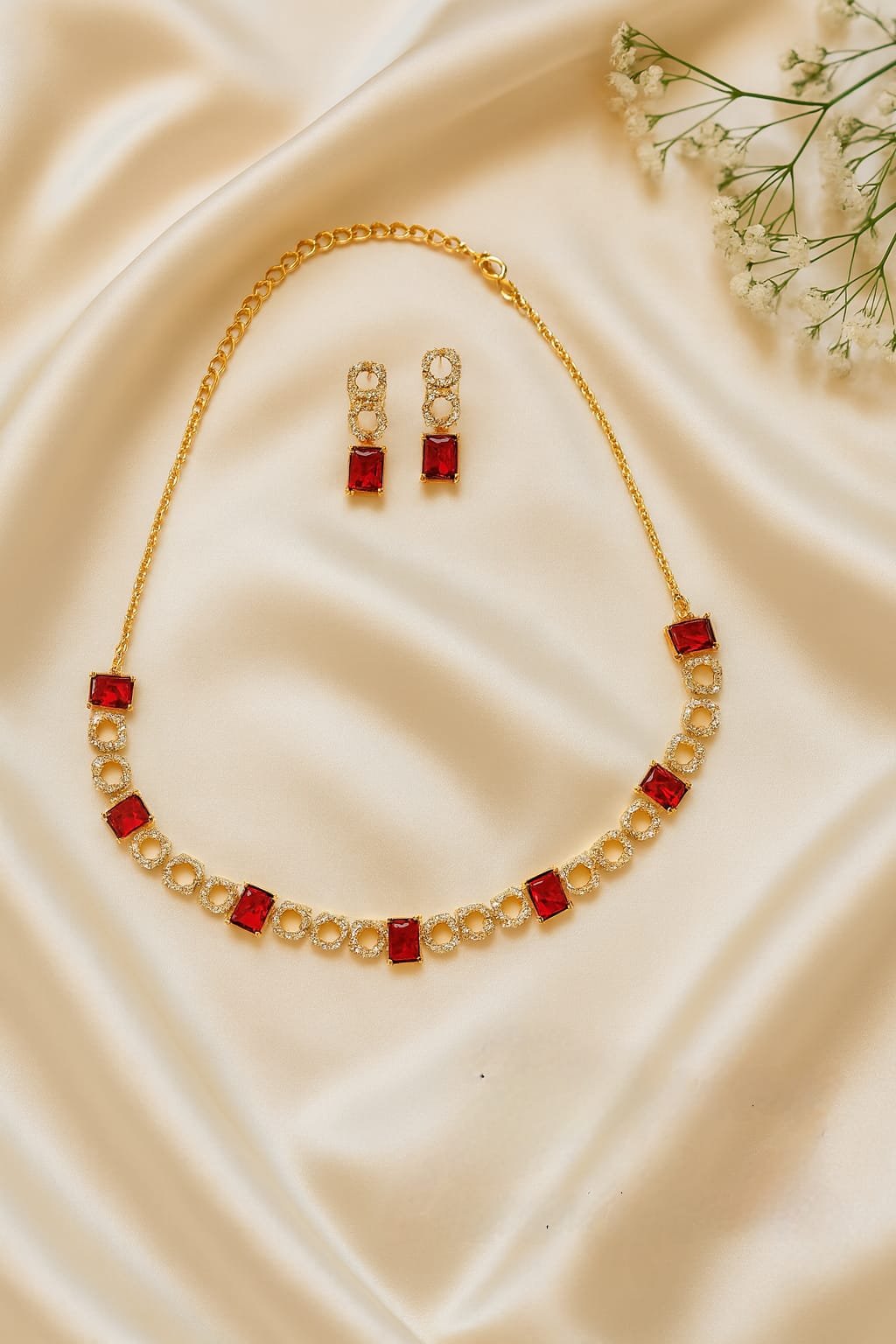 This stunning red stone necklace and earring set features bold rectangular ruby-look stones paired with sparkling gold textured links. The vibrant red colour gives a rich and glamorous finish, making it perfect for parties, weddings, receptions, and festive occasions.