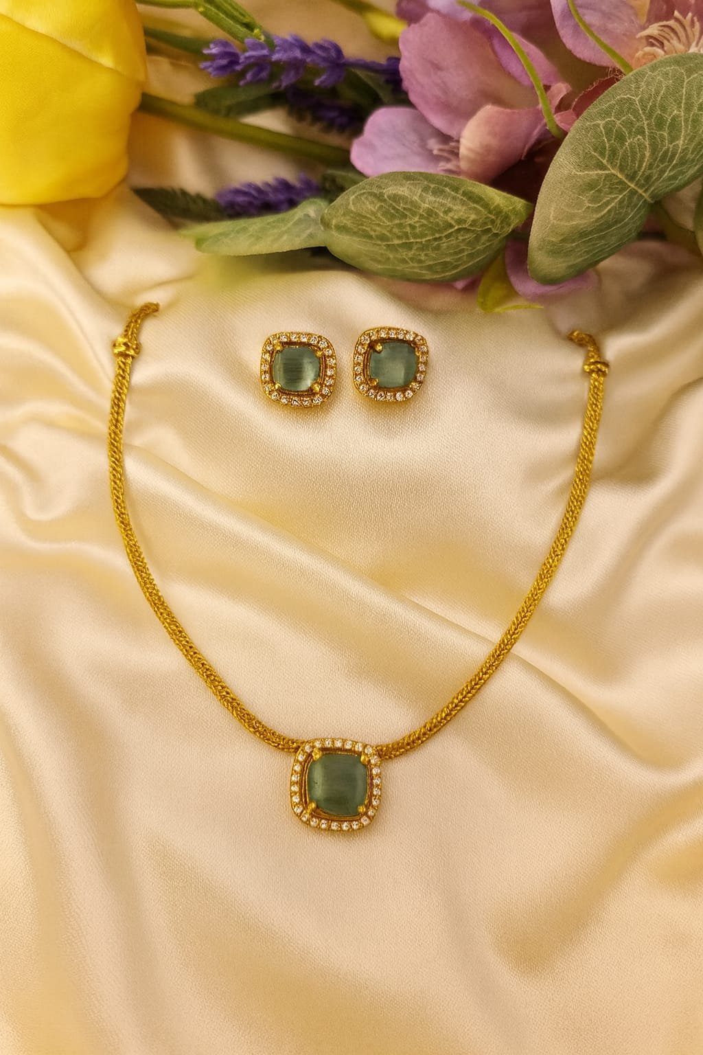 sparkling green coloured single stone necklace with earrings, suitable for all the occasions.