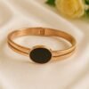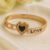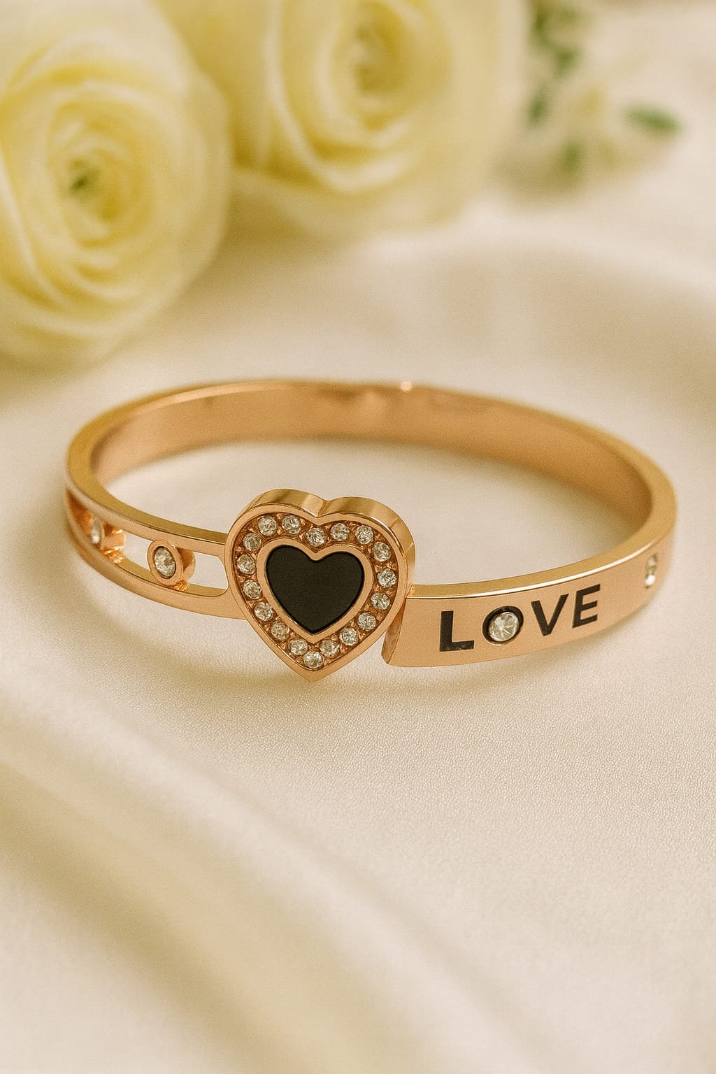 This beautiful stainless steel rose gold bracelet features a charming heart-shaped centrepiece with a black enamel core surrounded by sparkling cubic zirconia stones. The bracelet also includes the engraved word “LOVE”, making it a perfect symbol of affection and one of the most searched fashion jewellery styles for girls and women.