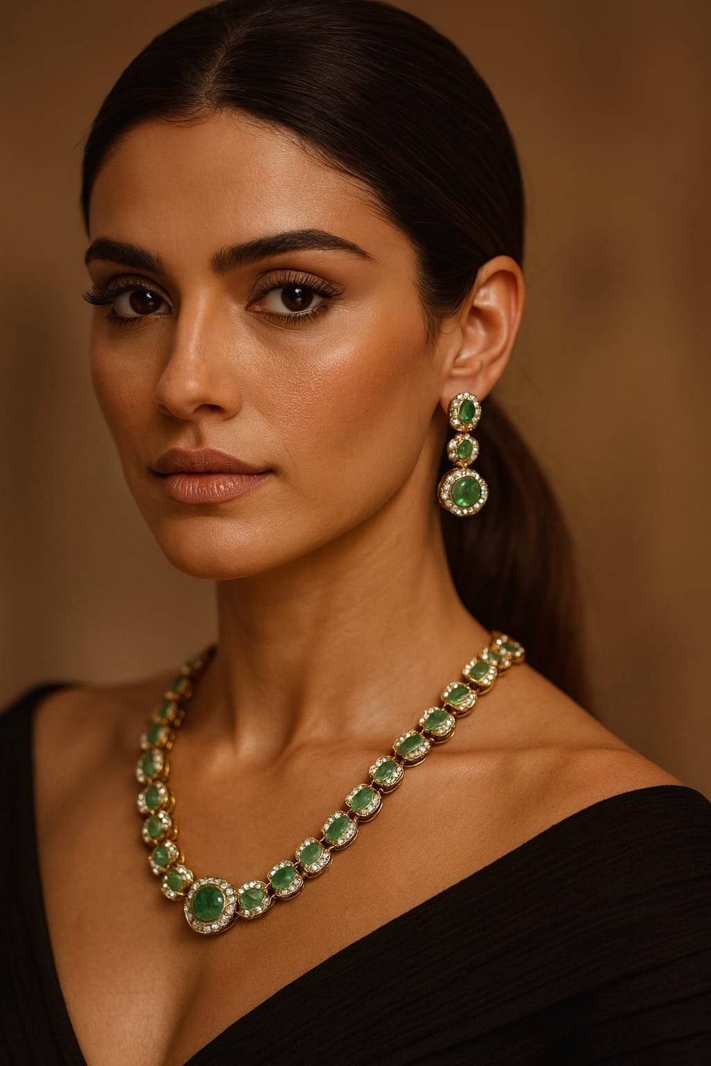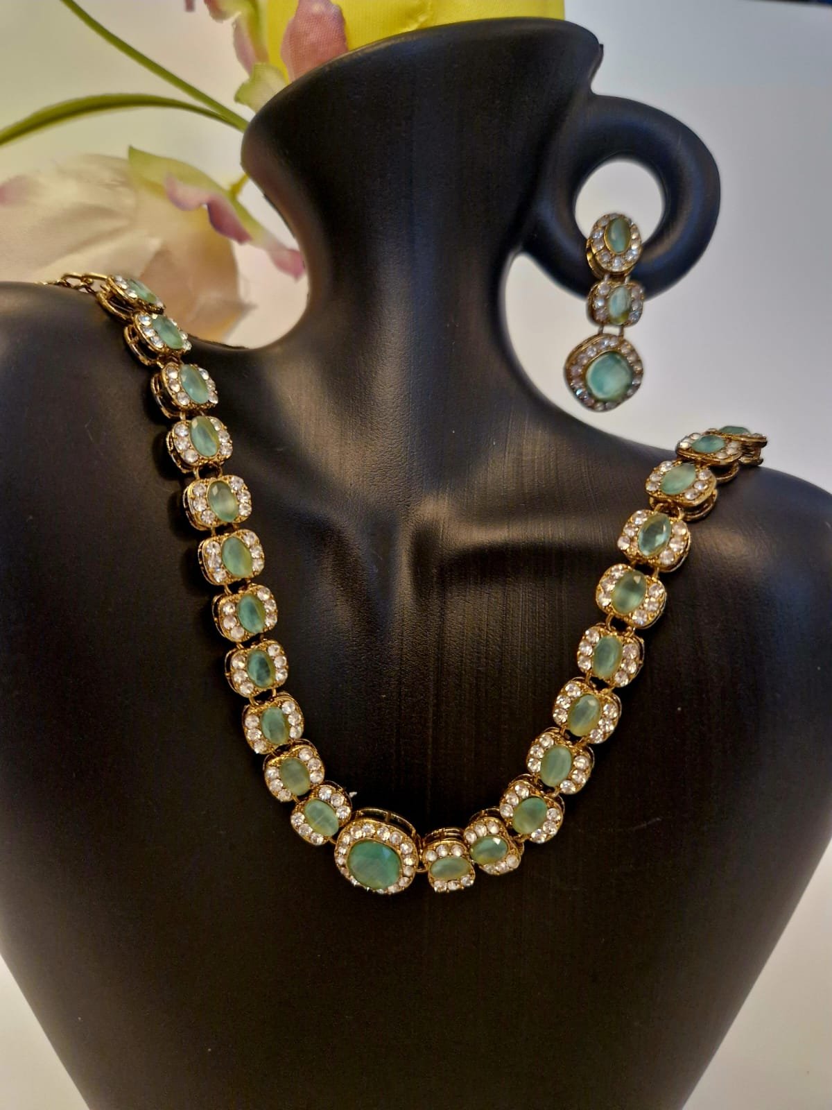 Elegant jewellery set featuring a, each adorned with soft green oval stones encircled by sparkling crystals. This luxurious design offers a timeless, sophisticated look—perfect for special occasions or adding a touch of glamour to any outfit.