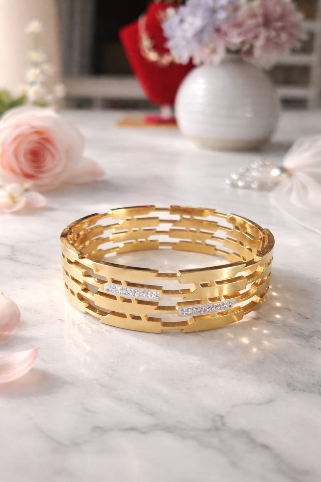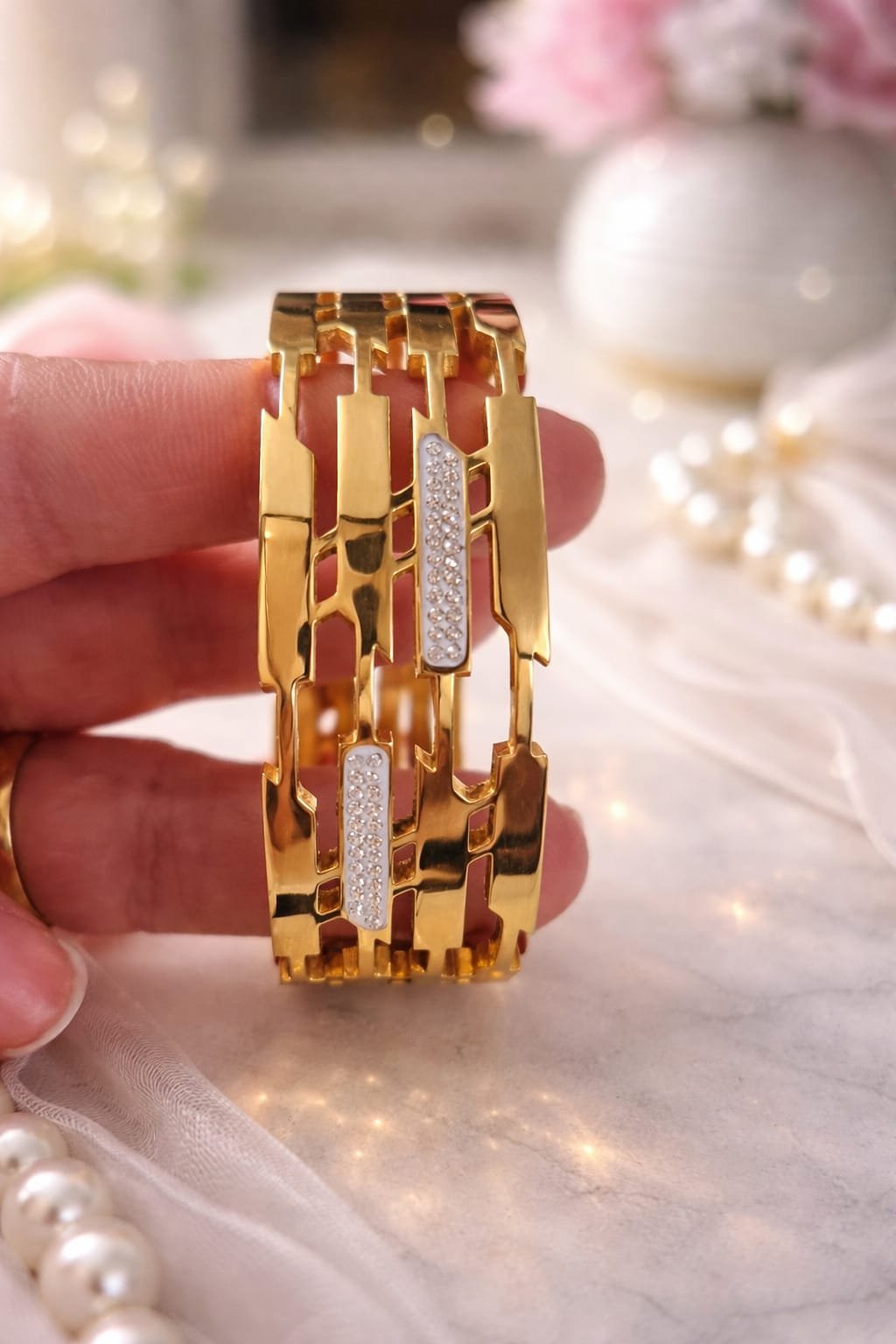 This elegant stainless steel bangle features a trendy open geometric design with a premium gold-plated finish and subtle diamond-style stone accents. The layered cut-out pattern gives it a bold yet sophisticated designer bracelet look, perfect for modern women who love stylish and minimal jewellery.