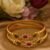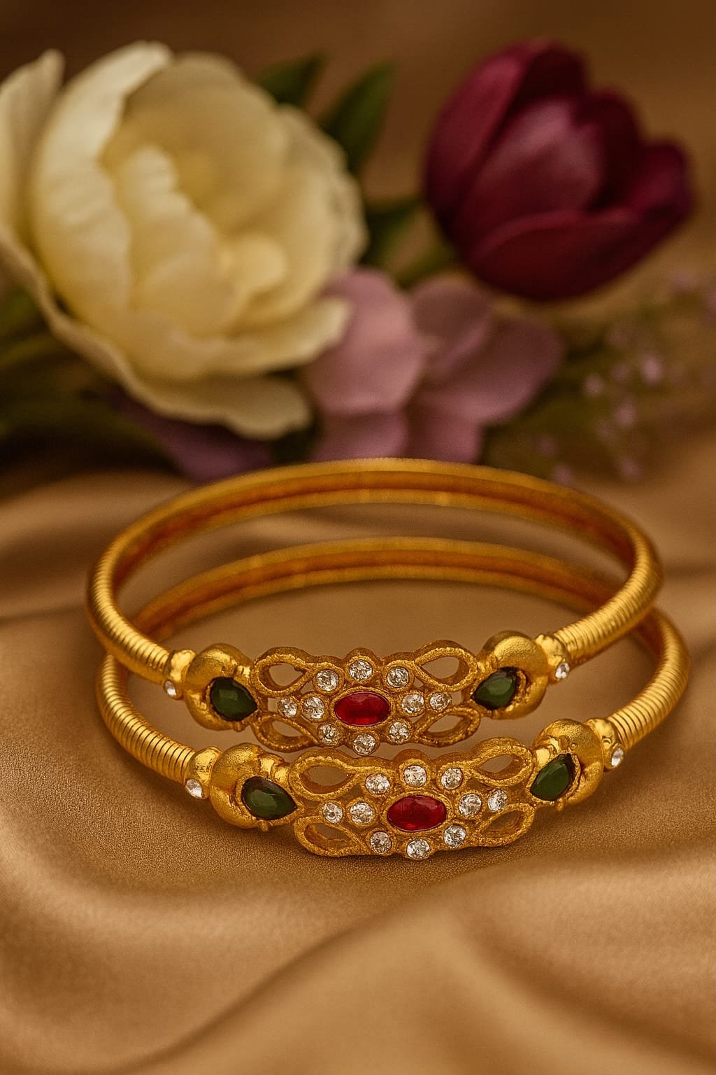 These traditional gold bangles feature a classic South Indian design with a detailed centrepiece adorned with red and green gemstones and shimmering CZ stones. The smooth, flexible bangle structure and rich gold finish give the piece a timeless and elegant look, suitable for both festive occasions and daily traditional wear, inner width 6cm.
