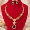 Elevate your ethnic look with this traditional gold choker necklace, exquisitely crafted with deep red gemstone accents and a regal gold finish. Designed with multiple delicate gold chains and a striking round ruby-colored centerpiece, this choker reflects timeless South Indian bridal jewelry artistry. The intricate detailing and dangling gold beads add a rich, royal charm, making it perfect for weddings, bridal wear, festivals, and special occasions.