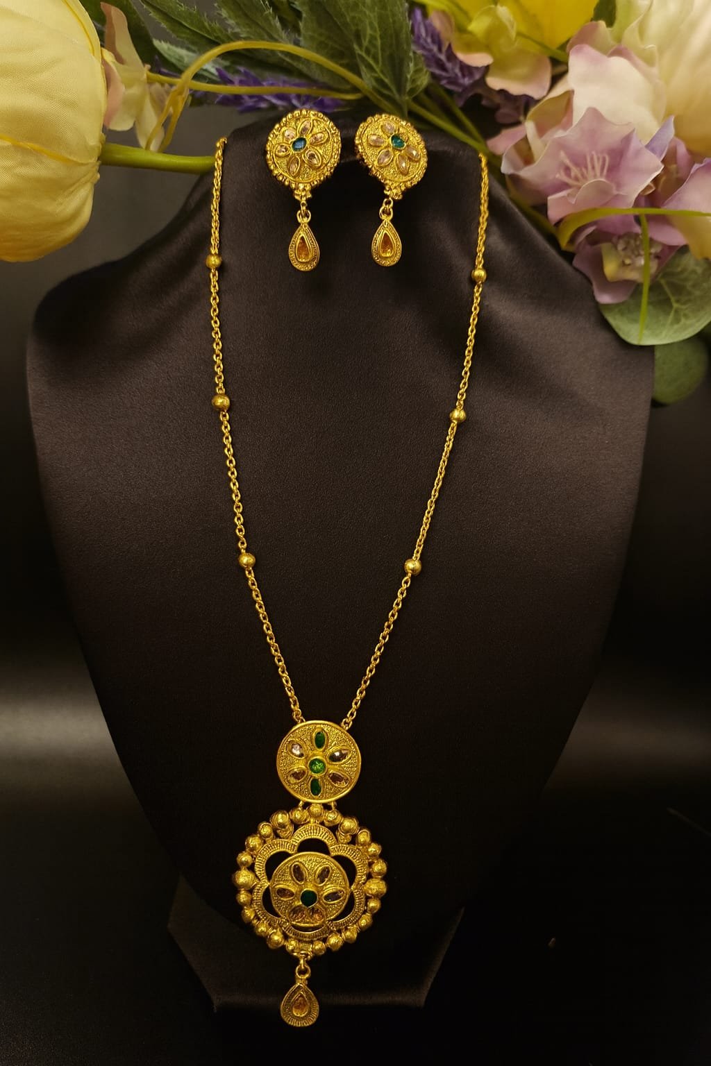Elevate your traditional look with this exquisite gold-plated necklace and earring set. Designed with intricate craftsmanship, the set features a long, elegant chain adorned with textured gold beads and a stunning dual-layer pendant. The pendant showcases detailed floral motifs embellished with green and white stones, adding a vibrant touch of sophistication. The matching earrings mirror the same intricate floral design with elegant teardrop danglers, making this set perfect for weddings, festive occasions, and special celebrations. A timeless blend of elegance and tradition, this jewellery set enhances any ethnic attire.
