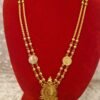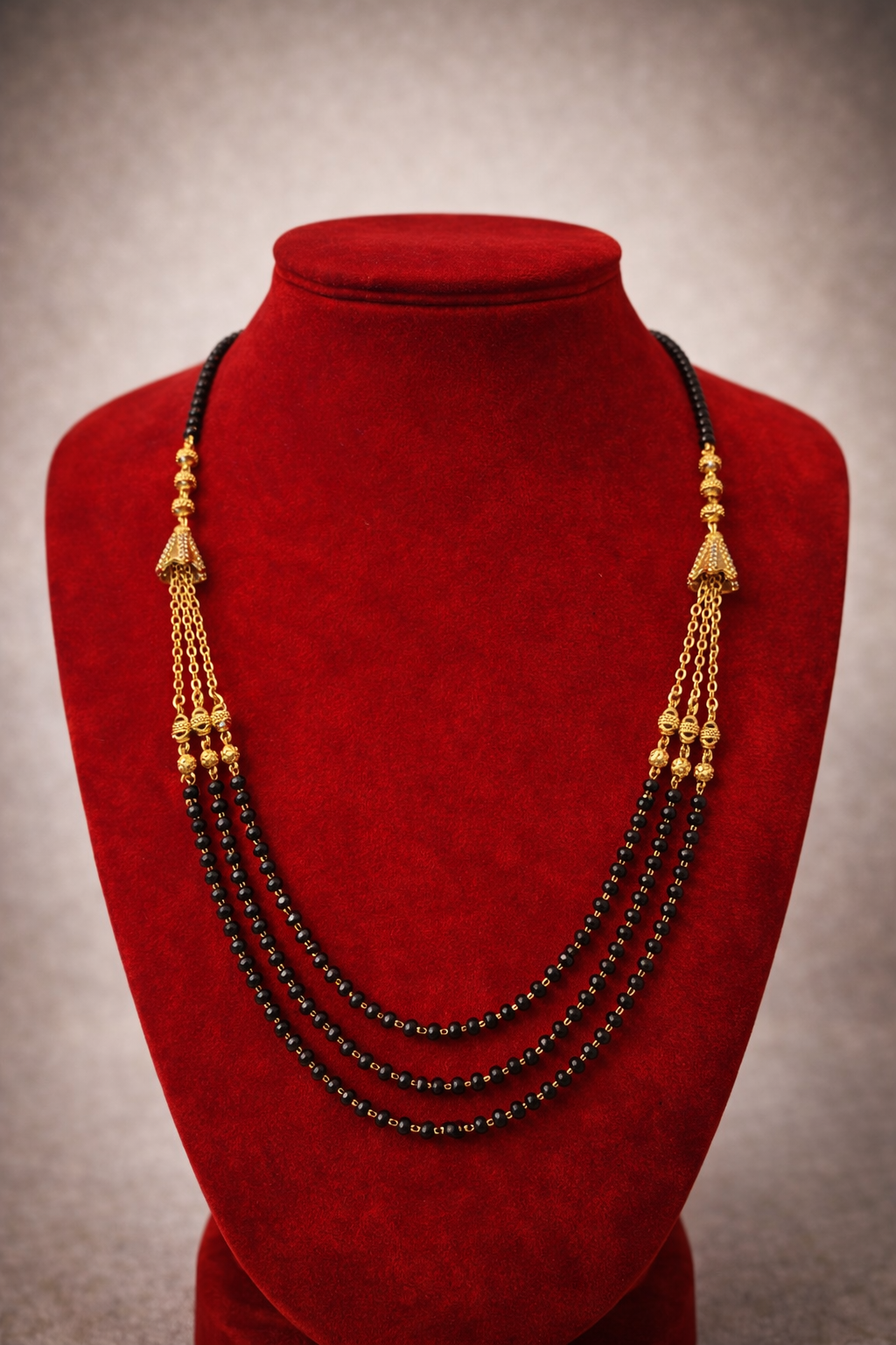 Traditional necklace features a timeless multi-layer design beautifully finished with gold plated detailing. Crafted with classic black beads and delicate gold elements, this necklace reflects heritage charm with a modern touch. The graceful layered drape makes every day elegance as well as special occasions
