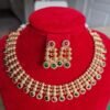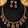 This stunning gold-plated palaka necklace features intricate detailing with vibrant red stone accents arranged in a graceful leaf pattern. The elegant design is complemented by matching traditional jhumka earrings, showcasing fine craftsmanship and antique finish. Perfect for weddings and cultural celebrations, this set adds a rich and majestic touch to any outfit.