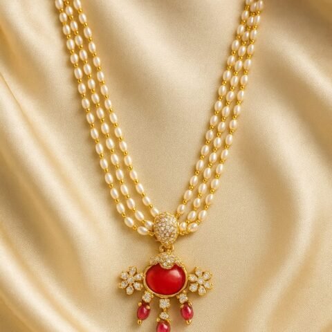 Three-Layer Pearl Necklace with Red Stone Pendant – Traditional Gold Plated Jewellery designed Isabel Jewels